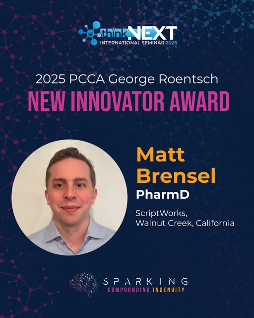 Matt Brensel has been recognized with the 2025 George Roentsch New Innovator Award at the PCCA International Conference, honoring innovation, collaboration, and leadership in pharmaceutical compounding.