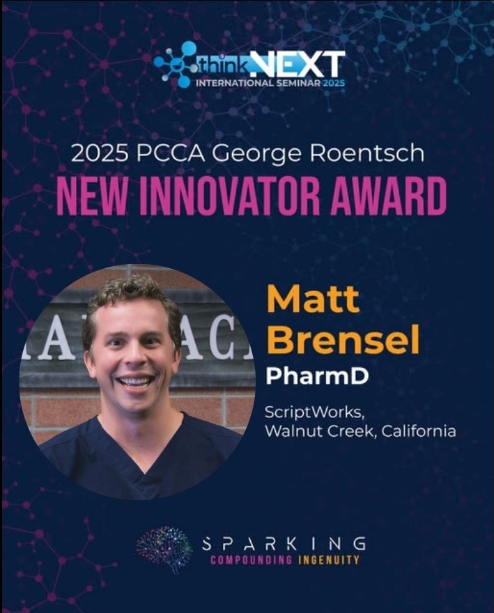 Matt Brensel has been recognized with the 2025 George Roentsch New Innovator Award at the PCCA International Conference, honoring innovation, collaboration, and leadership in pharmaceutical compounding.